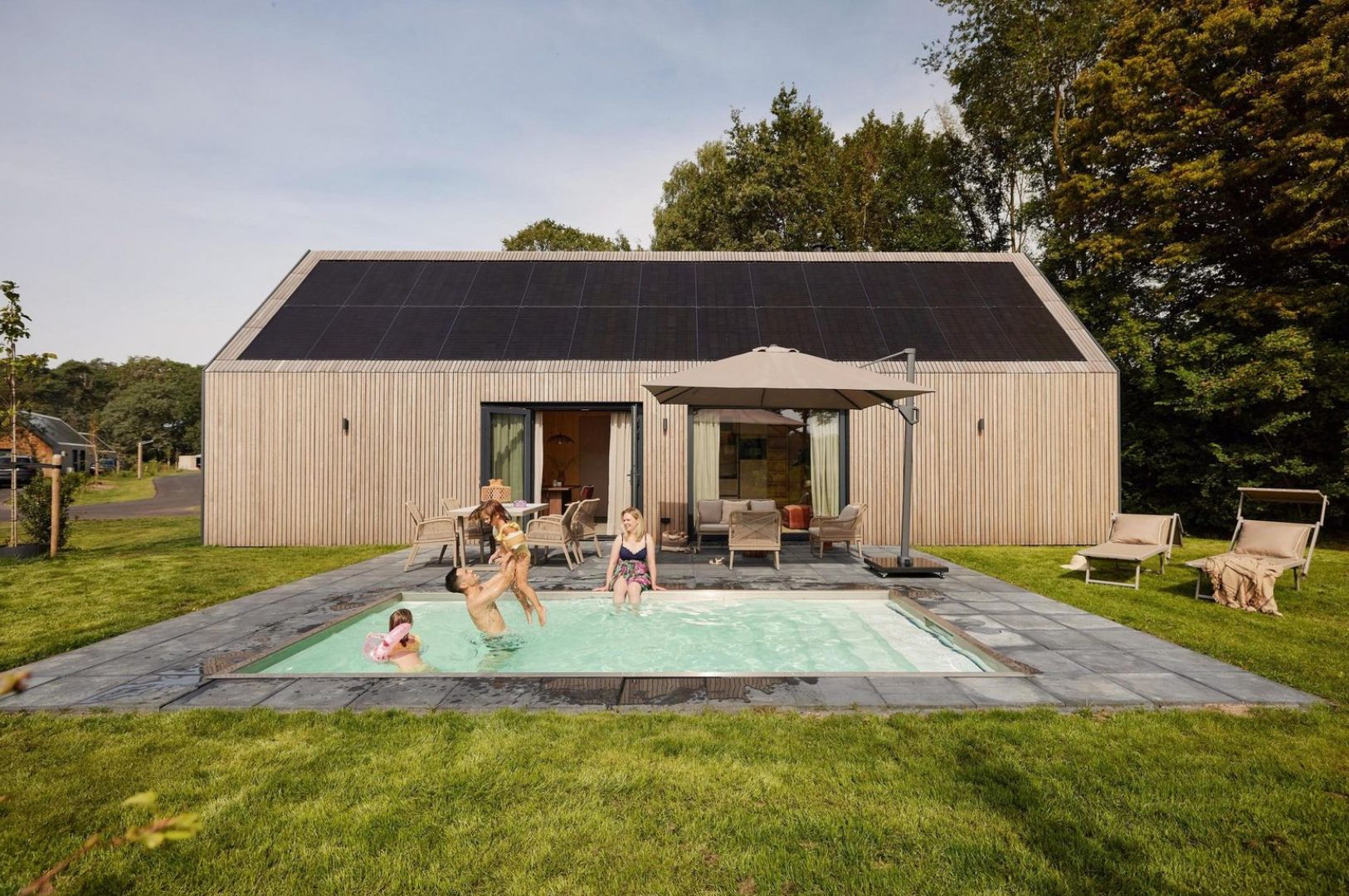 De Unbrick One Sauna & Zwembad – De Weelderik is een super de luxe én duurzame vakantiewoning voor 4 personen in Hengelo (Gelderland). Bij dit duurzame vakantiehuis is echt aan alles gedacht, van het verlichte oplaadpunt voor de elektrische auto, de volledig geïntegreerde zonnepanelen en de airconditioning, die zowel verwarmt en koelt. En je privé zwembad is het hele jaar door verwarmd, fantastisch toch?